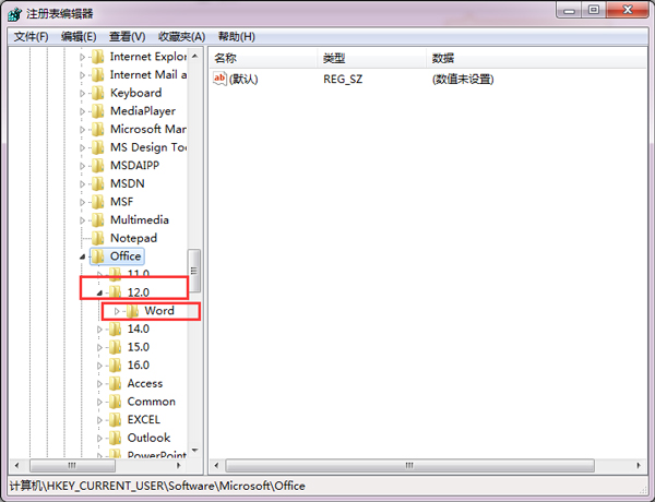 继续打开运行界面(win+R),在输入窗口输入regedit,打开注册表;1、双击“HKEY_CURRENT_USER”。2、依次双击打开“Software”-》“Microsoft”-》“Office”-》“12.0”,3、将“12.0”文件下的word重命名为word1,鼠标左键在空白区域左击一下就保存了(不要关闭注册表);